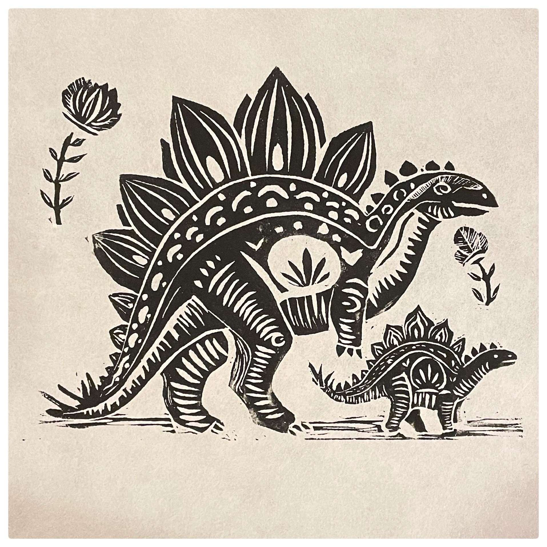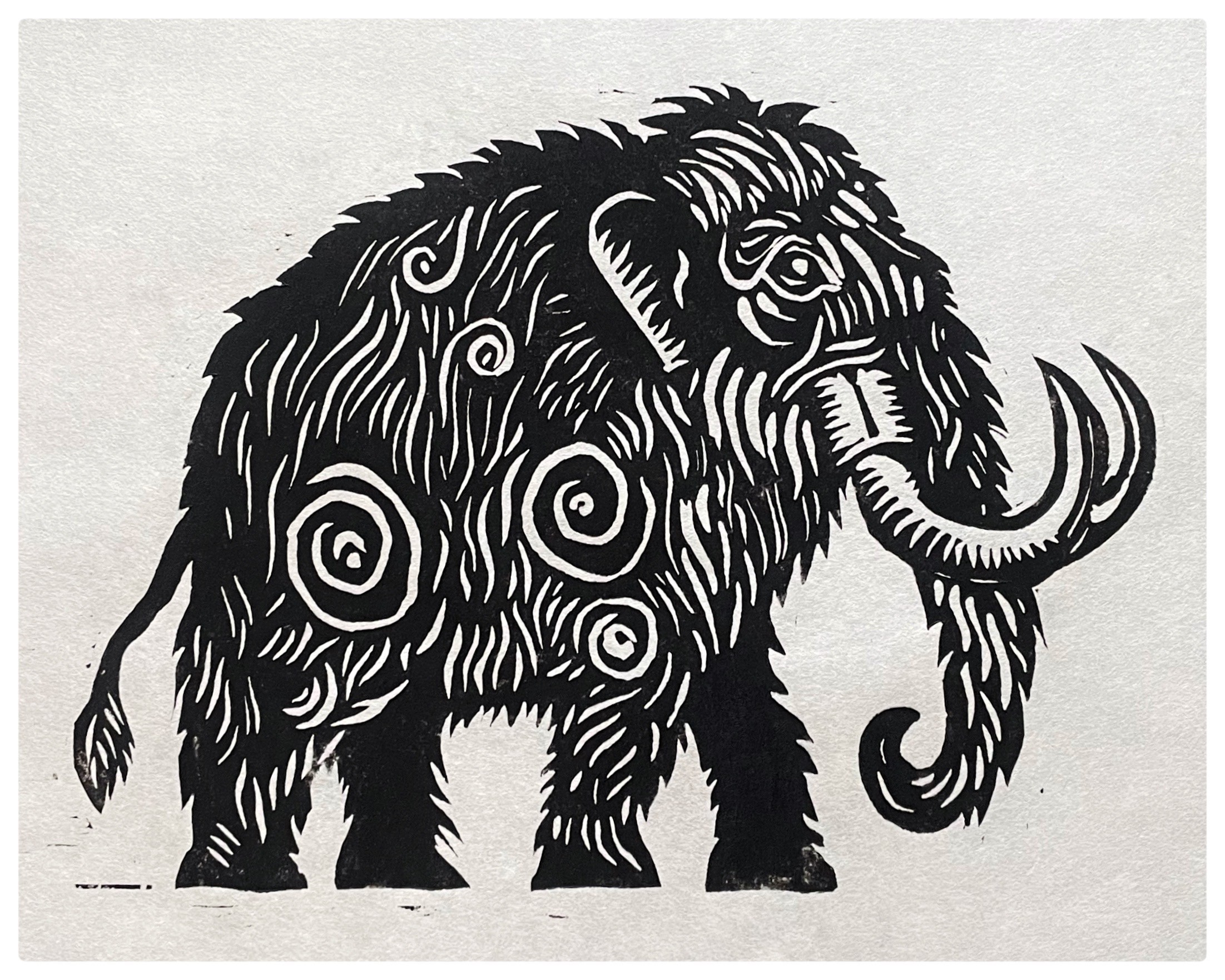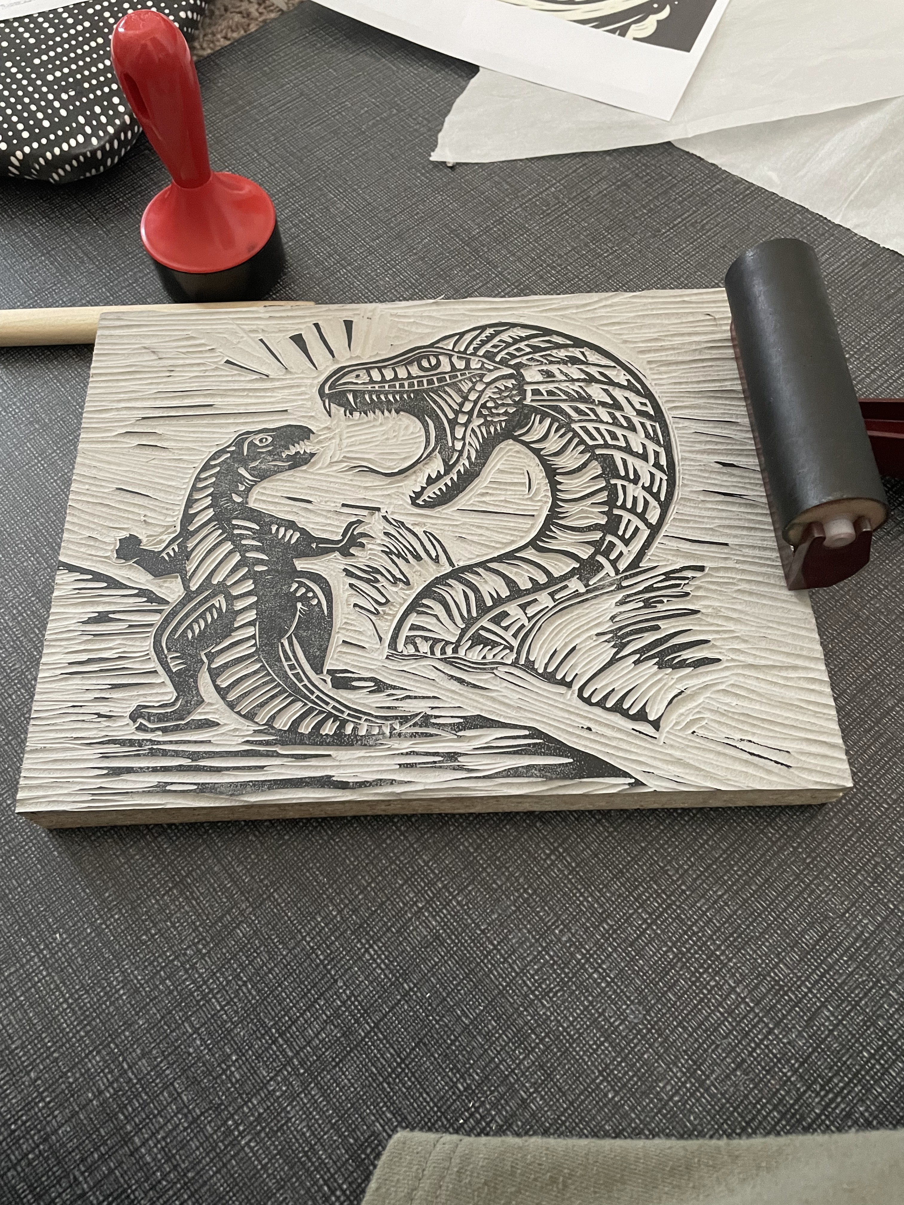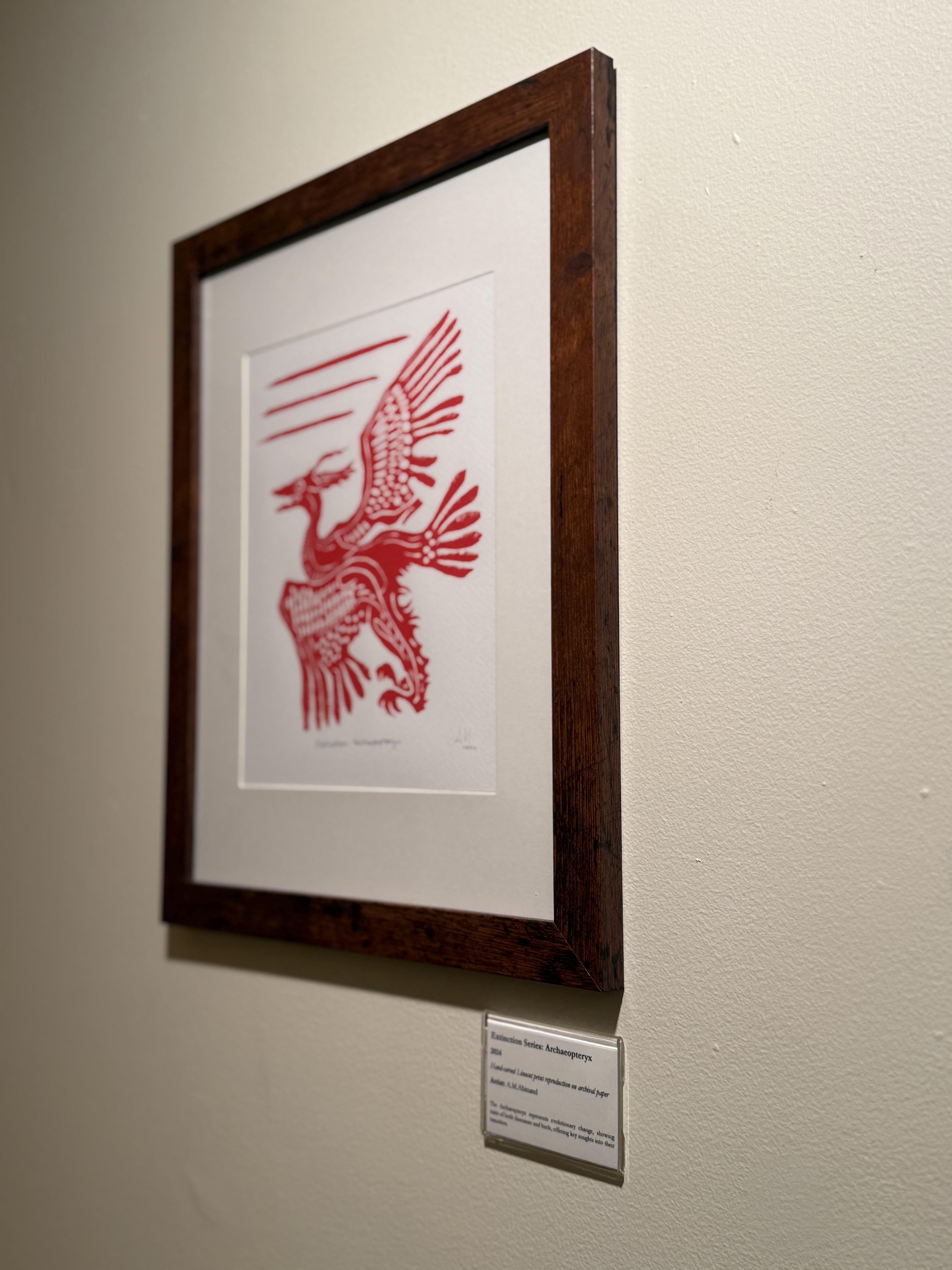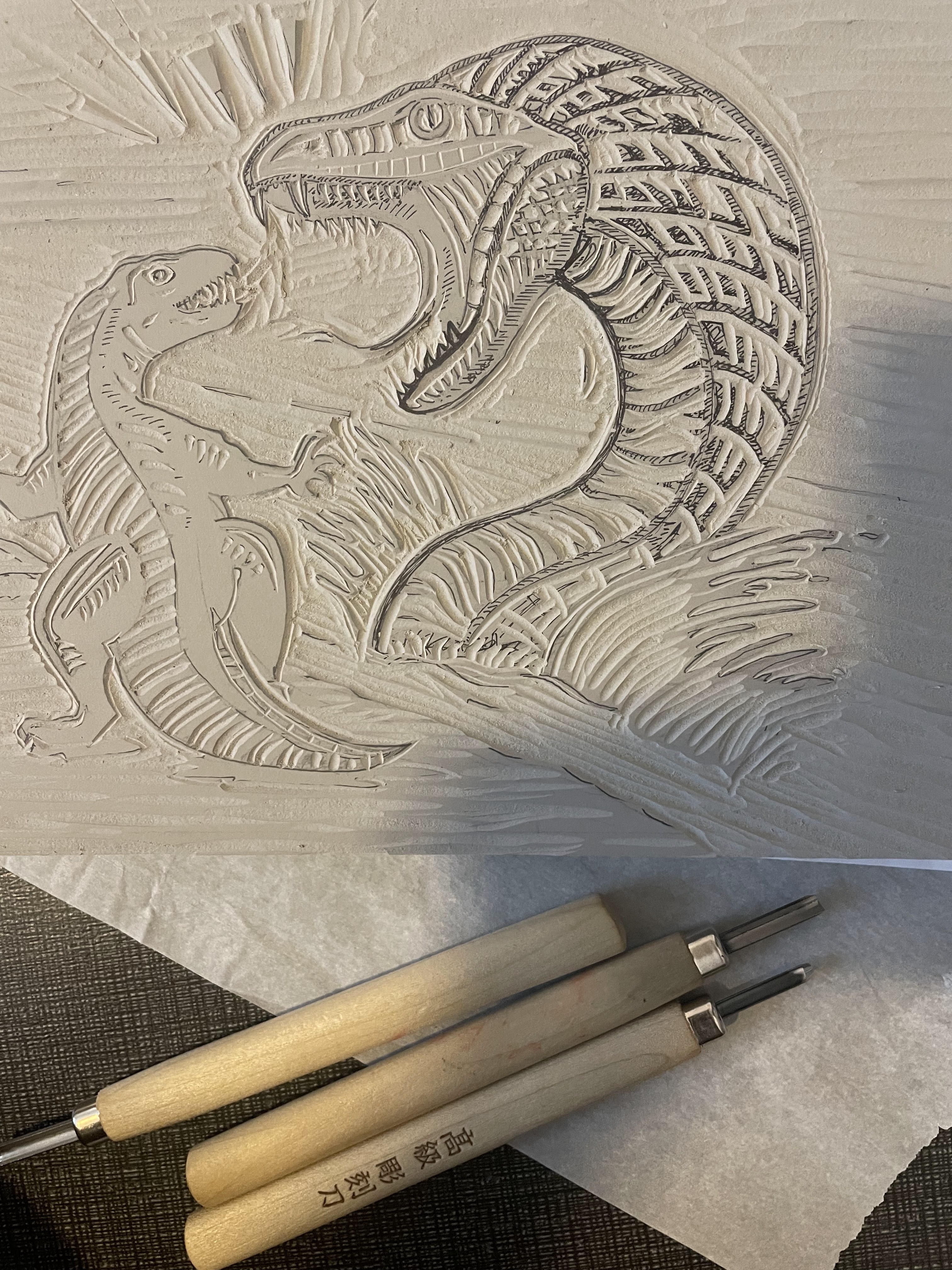 A series of five linocut prints centered on extinct species—T-Rex vs. Titanoboa, Woolly Mammoth, Archaeopteryx, Dodo, Ammonite, and Stegosaurus.